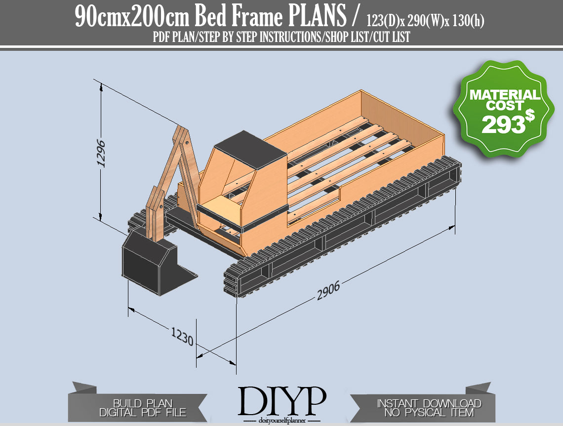 90x200cm bed frame plan, Excavator Bed Plans, Toddler bed Plan, Children Bed plan, Bulldozer bed plan