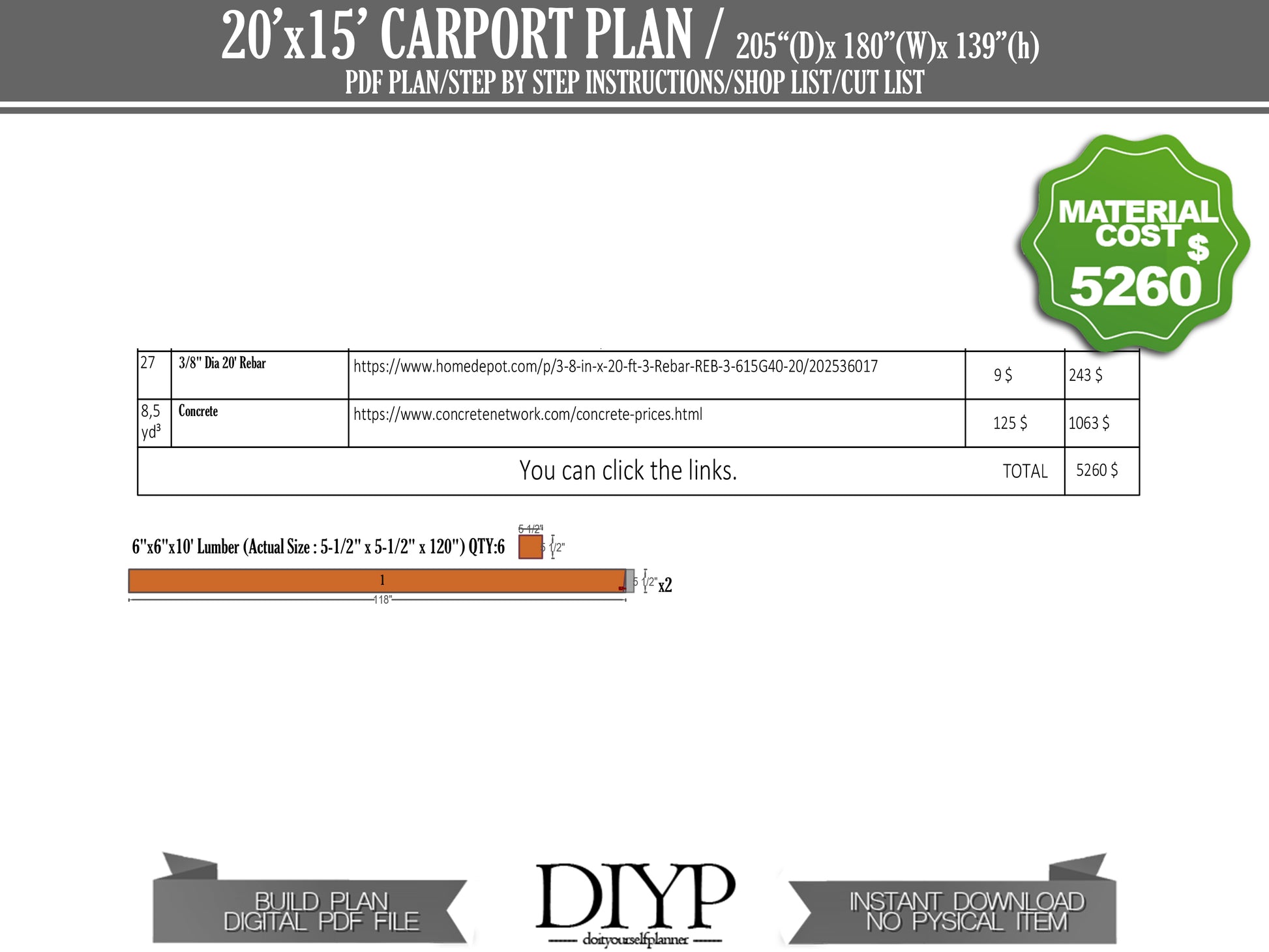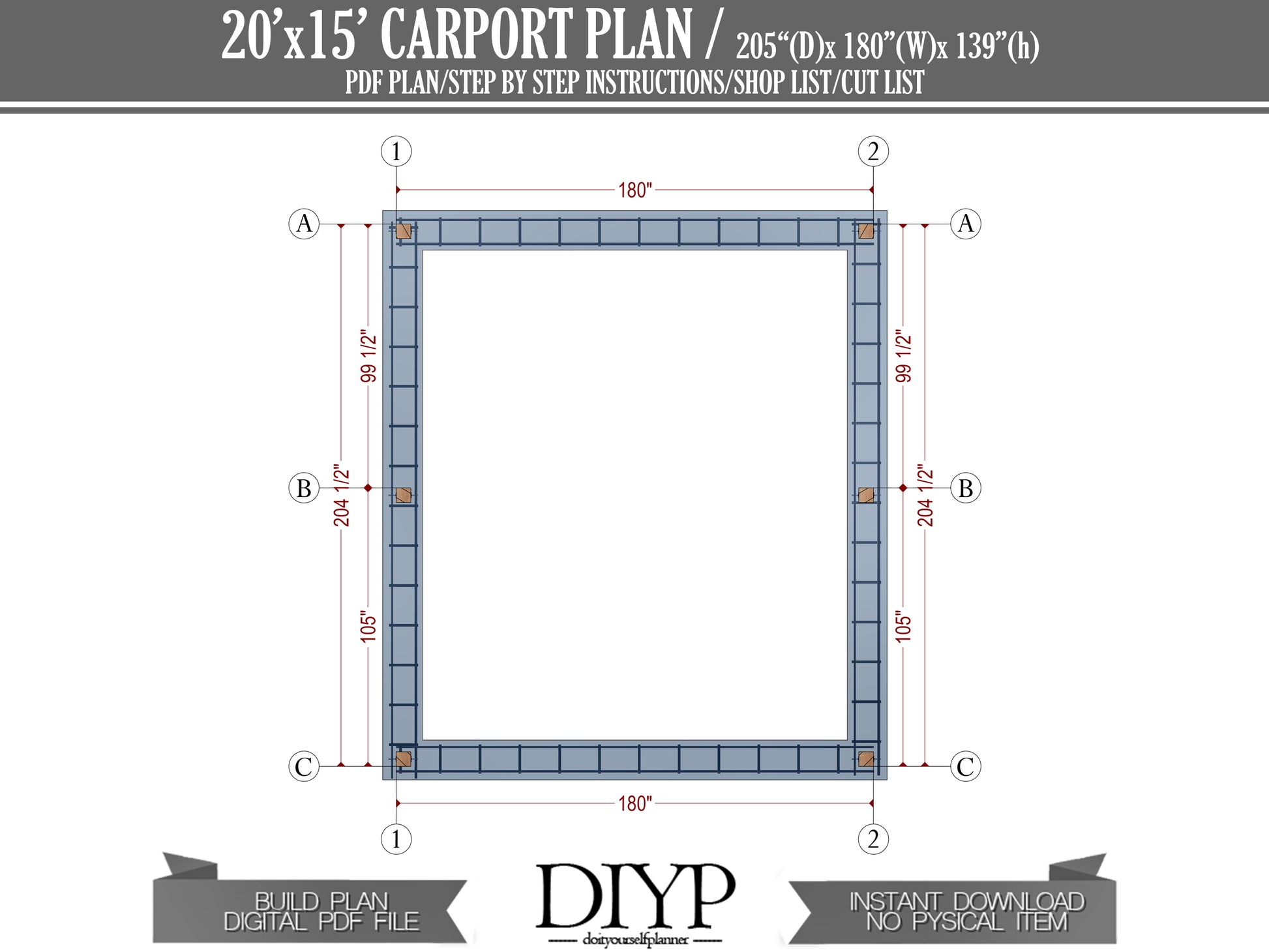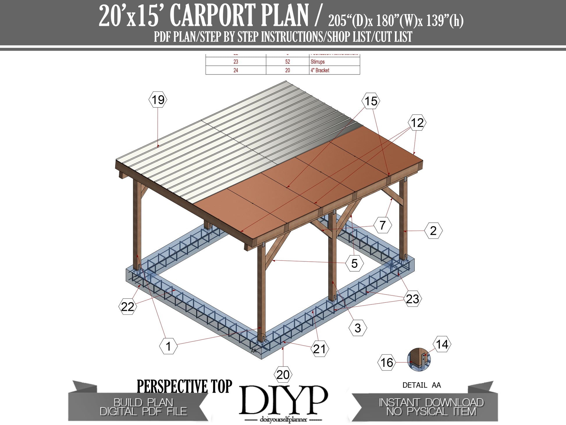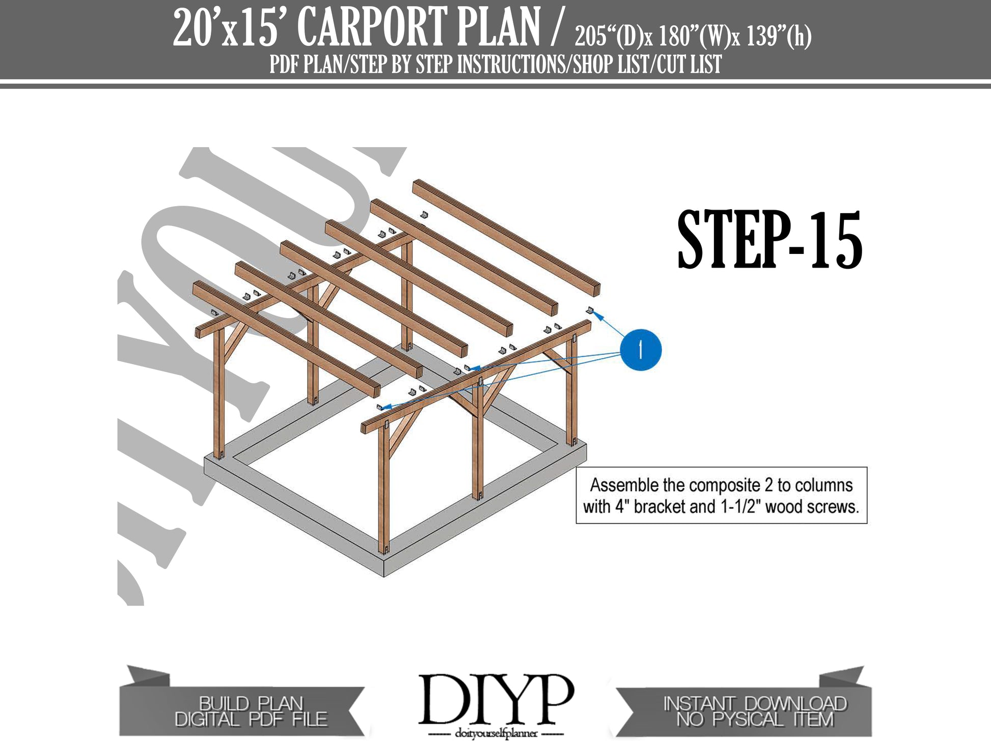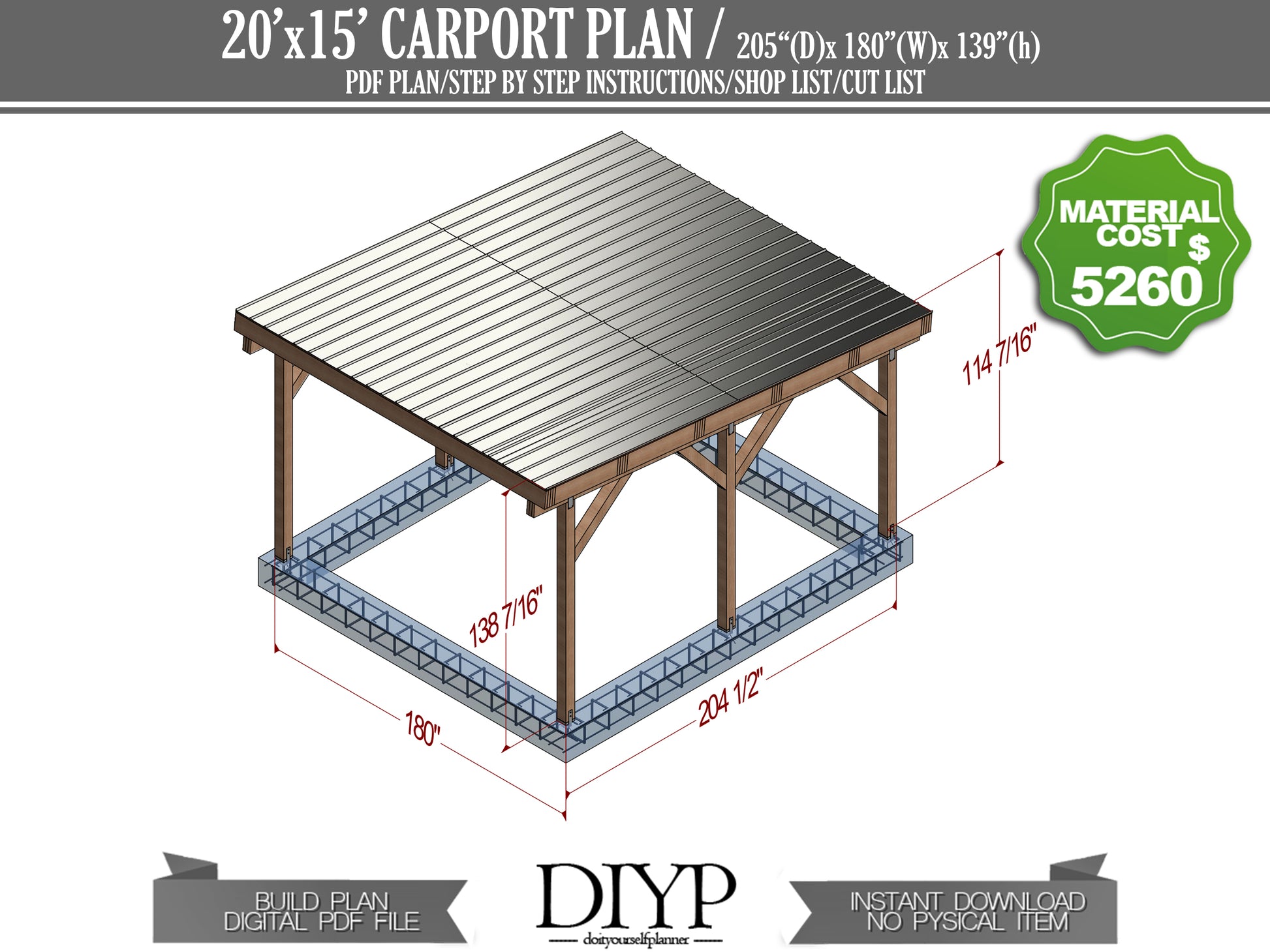 DIY Carport Plans - 15x20 Single-Pitched Roof - Instant Download, Construction Animation, Shopping List, Cut List, Parts List