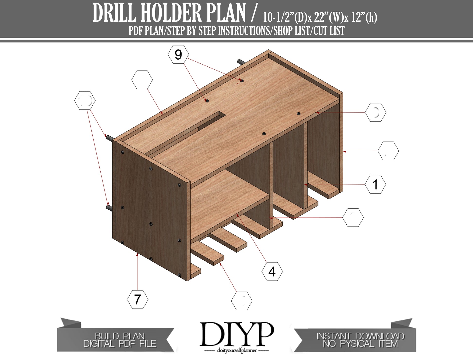 - Detailed 22" x 11" x 12" Drill Holder Plans: Step-by-step instructions with clear diagrams and dimensions guide you through the entire construction process. Even if you're a beginner woodworker, you'll find these plans easy to understand and execute.