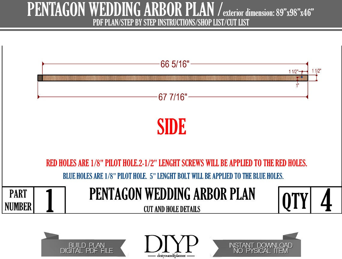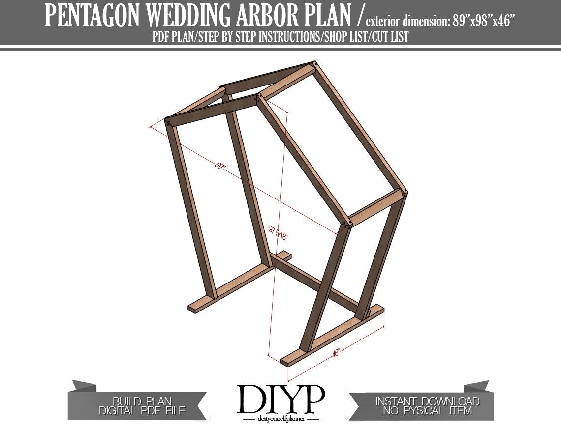 Would you like to make your own pentagon wedding arbor for a low price.Great idea for your happiest day.Everything you need is in this plan.This wedding arch approx. cost is 72$.
