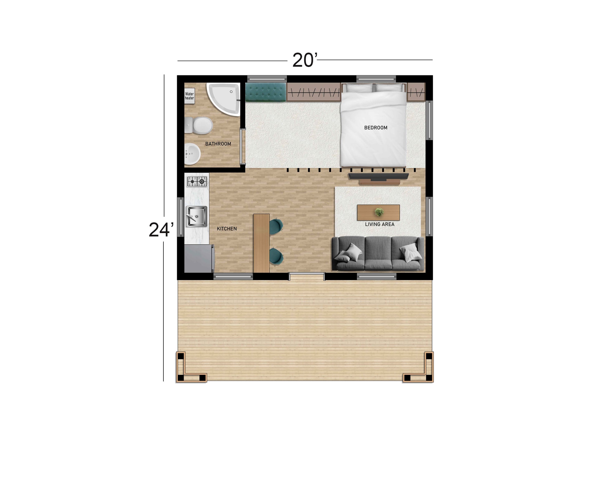 - Total Dimensions: 20 ft x 24 ft (including veranda)