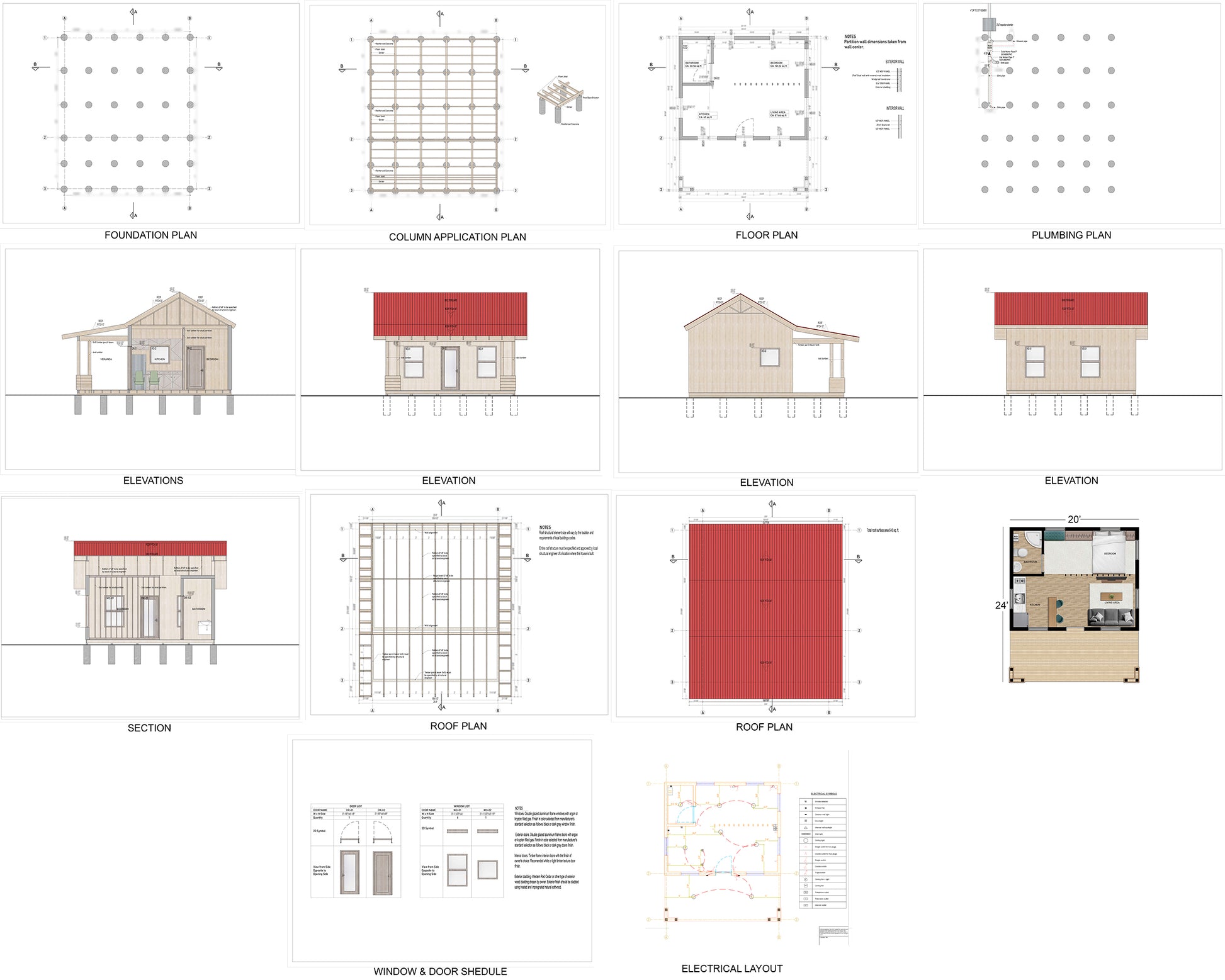 - Roof Plan: Illustrates the roof structure, including slopes, overhangs, and material specifications.