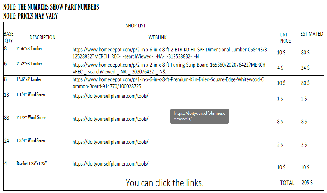 The plan includes a shopping list with lumber requirements along with screws and brackets which direct users to Home Depot and Amazon for quick purchases.