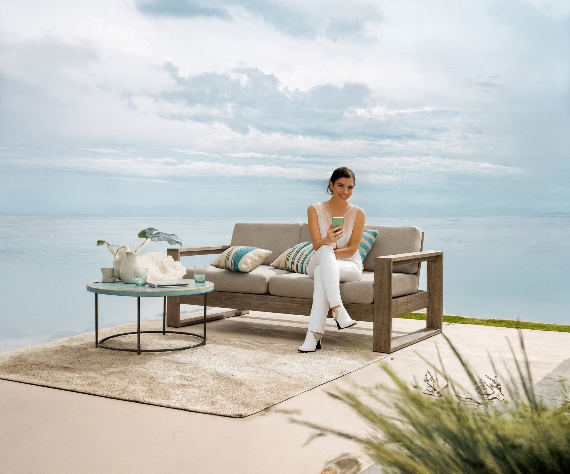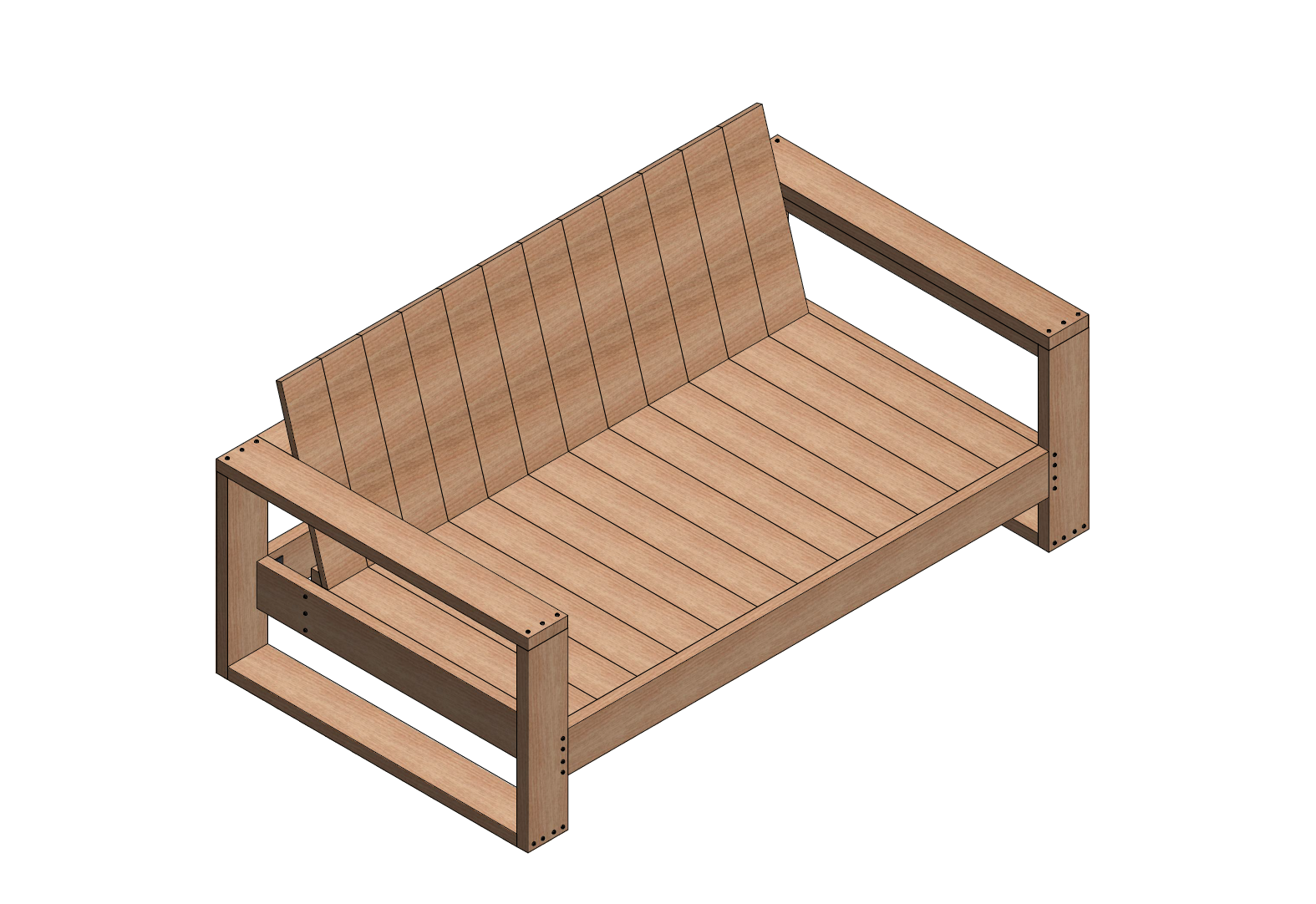 The guide presents a detailed woodworking plan to construct a contemporary outdoor sofa with two seating positions and armrests. The two-seater sofa offers broad armrests and a solid wood construction with slatted back elements that result in a contemporary aesthetic design. This piece suits outdoor spaces including patios and porches and decks and garden seating areas.