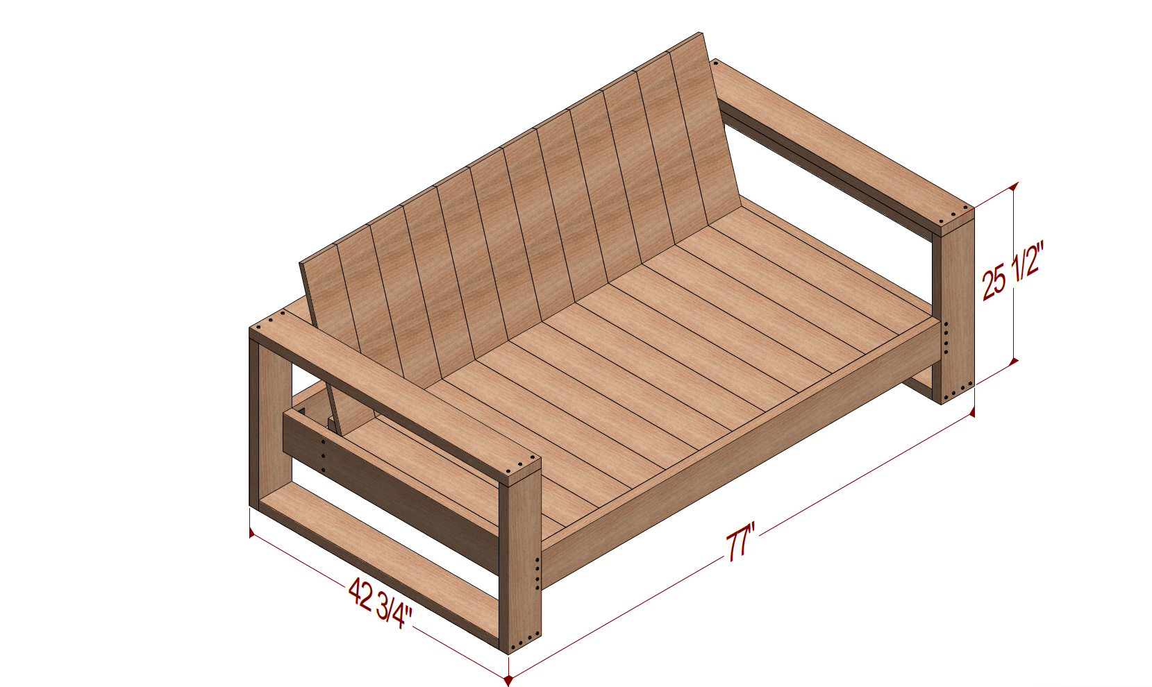 The finished sofa will measure 77” wide and 42 ¾” deep and 25 ½” tall (196 cm x 108 cm x 65 cm) while accommodating standard outdoor seat cushions (cushion purchase links are included in the plan).