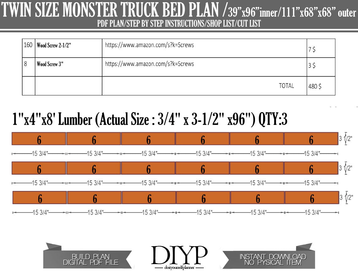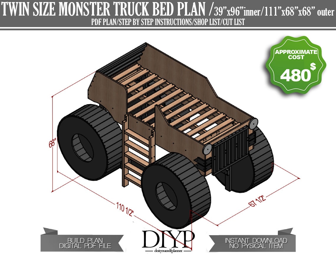 Make your child's twin size monster truck bed yourself.The best gift for your child. If you want this bed, just purchase this plan and start to make. Even you are in the beginning level of woodworking, don't worry it is very simple. With this plan, you have everything you need. It includes shopping list, step by step setup instructions, how to places lumber pieces, how to cut, where to screw, where to ream or which piece you should nail. All you have to do is follow the steps in the pdf file you downloaded.